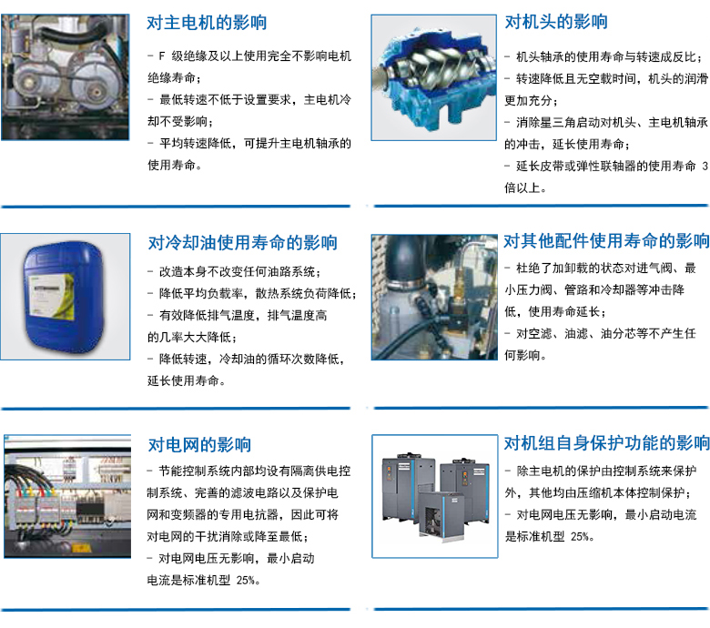 ·变频节能系统采用了变转速控制技术,压缩机的排气 量可以和用户的用气量完美的结合起来,完全避免了卸载 浪费额定功率45%的损耗。运用先进的PLC与PID控制调节, 可以将压力控制在±0.1bar的范围内,始终恒压在6bar状 态下工作,因而更加节能,因为每降低1bar的工作压力, 可以节约7%的能量消耗,所以直接节能14%。另外压缩空 气系统中的泄露也显著减少,如6bar处的泄露要比7bar处 的泄露少15%左右。
